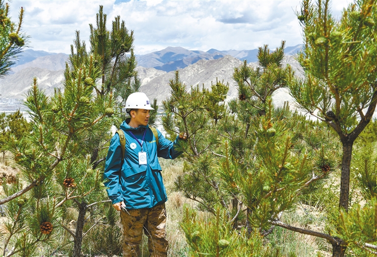 工程的綠意還延伸至拉薩貢嘎機(jī)場(chǎng)周邊的山體,山南市林草局林業(yè)和草原有害生物防治站檢疫員次仁羅布在造林現(xiàn)場(chǎng)進(jìn)行苗木復(fù)檢工作,復(fù)檢結(jié)果顯示這批苗木的成活率達(dá)到92%?!斑@里是走出貢嘎機(jī)場(chǎng)的第一站,旅客們可以直接看到我們種下的綠色,很有意義?!贝稳柿_布說。