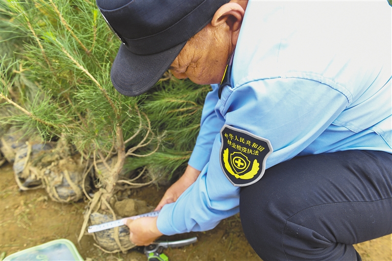 在拉薩南北山綠化工程2024年度鞏固提升(貢嘎機(jī)場(chǎng)周邊山體)工程項(xiàng)目上,林業(yè)檢疫執(zhí)法工作人員在檢查樹苗根部土球是否達(dá)標(biāo)。新華社記者 晉美多吉 攝