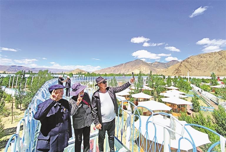 昔日山溝荒地,今日旅游盛景。走進西普農(nóng)博園,穿過一段五彩斑斕的“時光隧道”燈光秀場,園內(nèi)美景浮現(xiàn)在眼前,仿佛進入了世外桃源。果蔬花卉爭奇斗艷,西藏車厘子、陽光玫瑰葡萄正吸吮陽光雨露不斷成熟;高原風(fēng)光沁人心脾,青樸山、雅魯藏布江盡收眼底;運動康養(yǎng)放松身心,游泳池、玻璃棧道、高空秋千讓人活力迸發(fā);休閑娛樂花樣繁多,圍爐煮茶、花園火鍋、親子樂園等讓幸福生活煥新添彩;研學(xué)探索妙趣橫生,梅花鹿、駱駝、孔雀、鴕鳥等生靈構(gòu)成一幅人與自然和諧相處的美好畫面。