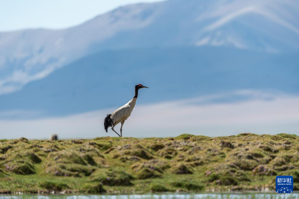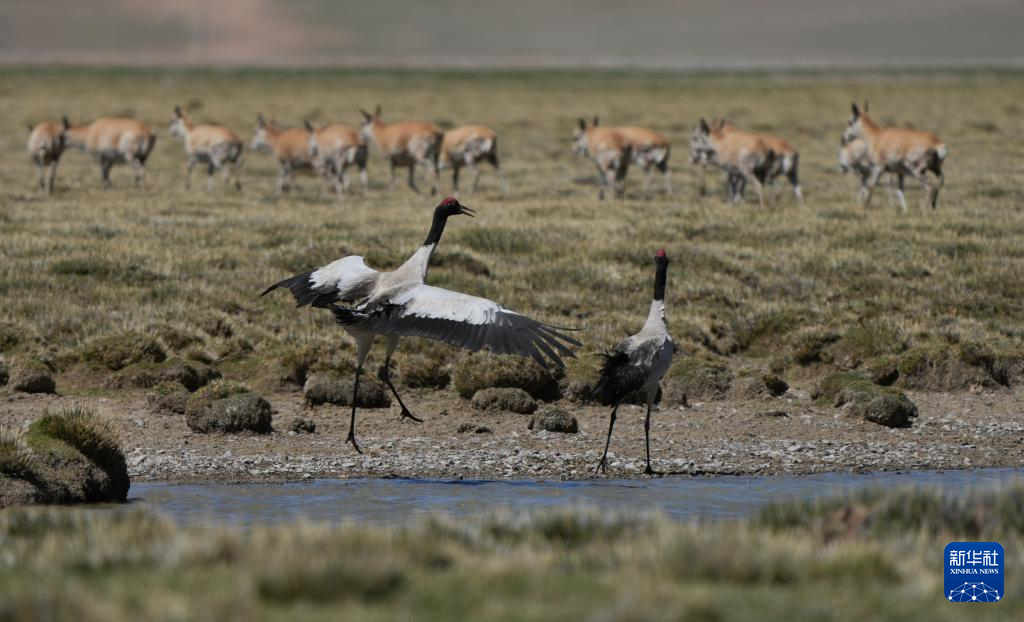 黑頸鶴在濕地和藏羚羊一起覓食(6月8日攝)。新華社記者 晉美多吉 攝