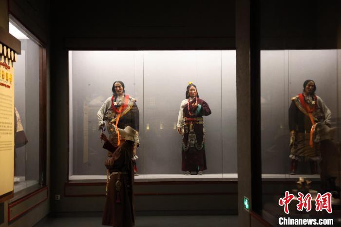 7月24日,參加“中國式現(xiàn)代化的萬千氣象·網(wǎng)絡(luò)名人青海行”活動的網(wǎng)絡(luò)名人,抵達江河源頭青海玉樹藏族自治州,在玉樹州博物館一覽自然與人文之美。玉樹州博物館是玉樹地震災(zāi)后重建十大標(biāo)志性建筑之一,分為序廳、自然展區(qū)、人文展區(qū)、臨時展廳。其通過實物標(biāo)本等方式,展示了三江源和可可西里的野生動物、草地、森林,以及玉樹州的歷史、建筑、服飾、飲食等。圖為玉樹州博物館內(nèi)的服飾文化展示。中新社記者 張?zhí)砀?攝