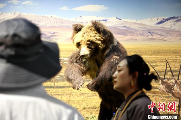 7月24日,參加“中國式現(xiàn)代化的萬千氣象·網(wǎng)絡(luò)名人青海行”活動的網(wǎng)絡(luò)名人,抵達江河源頭青海玉樹藏族自治州,在玉樹州博物館一覽自然與人文之美。玉樹州博物館是玉樹地震災(zāi)后重建十大標(biāo)志性建筑之一,分為序廳、自然展區(qū)、人文展區(qū)、臨時展廳。其通過實物標(biāo)本等方式,展示了三江源和可可西里的野生動物、草地、森林,以及玉樹州的歷史、建筑、服飾、飲食等。圖為工作人員介紹棕熊等野生動物分布情況。中新社記者 張?zhí)砀?攝
