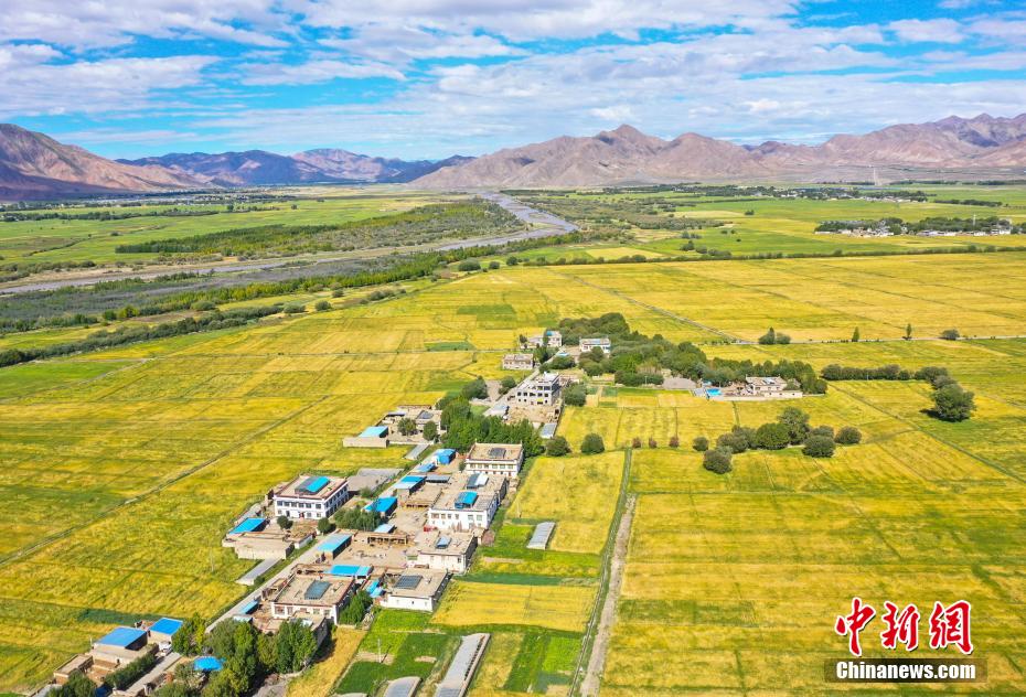 8月25日,西藏日喀則白朗縣仁青崗村,田園、村莊、河流、公路、遠(yuǎn)山交相輝映,構(gòu)成一幅美麗的田園風(fēng)光畫卷。(無(wú)人機(jī)照片)