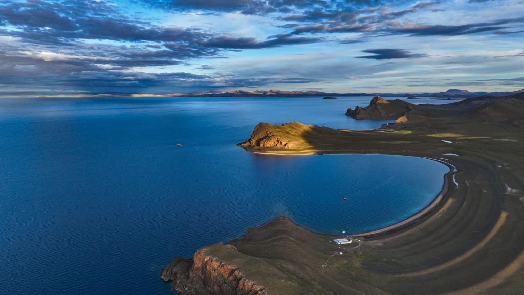 7月11日傍晚的納木錯湖畔(無人機(jī)照片)。新華社記者 晉美多吉 攝