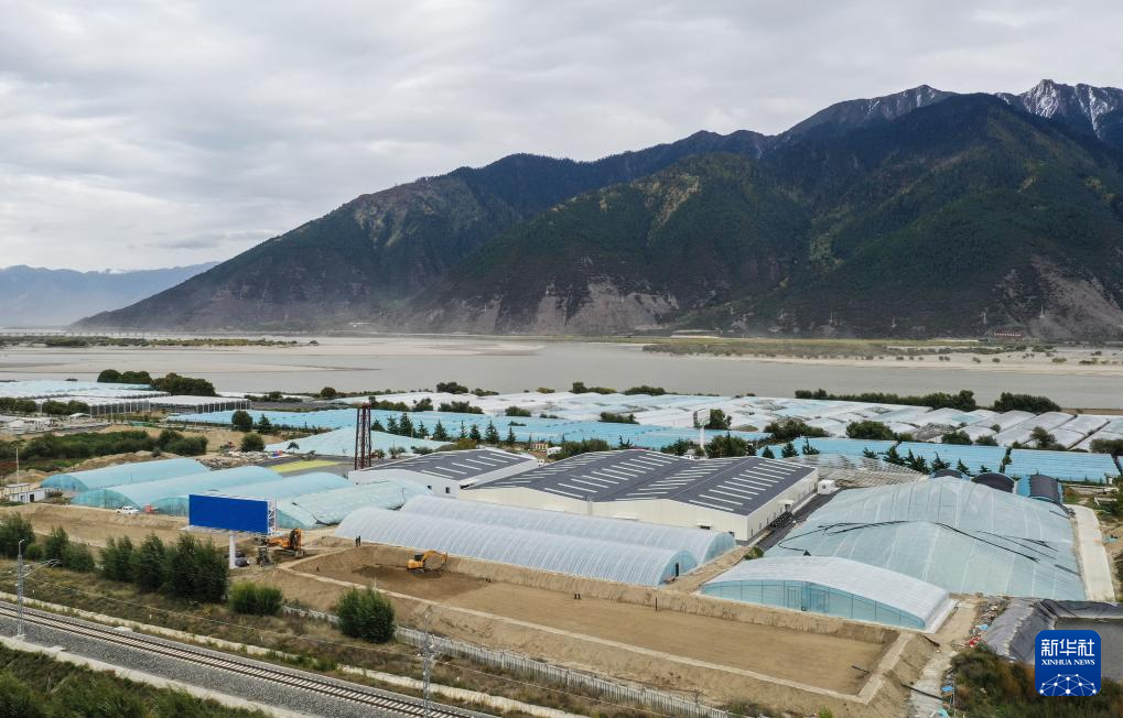 在西藏林芝市米林農(nóng)場(chǎng)內(nèi)的粵林高原漁業(yè)科技園,依托當(dāng)?shù)赜欣h(huán)境而興建的養(yǎng)殖育種基地初顯規(guī)模(無(wú)人機(jī)照片,10月24日攝)。新華社記者 李賀 攝