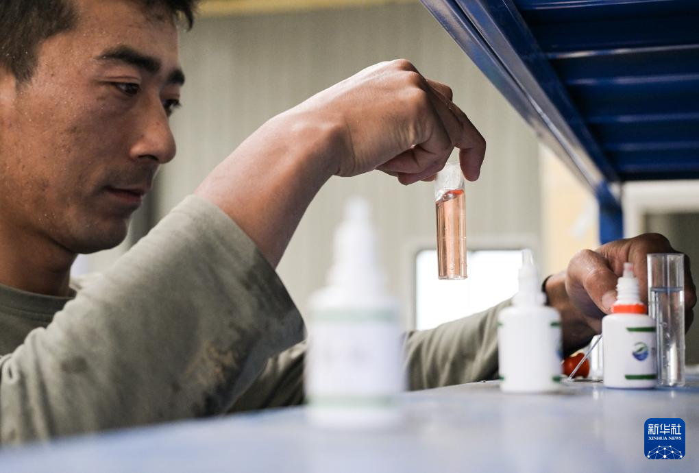 在西藏林芝市米林農(nóng)場(chǎng)的粵林高原漁業(yè)科技園工作的藏族小伙尼瑪旺堆在冷水魚(yú)養(yǎng)殖大棚內(nèi)檢測(cè)水樣(10月24日攝)。新華社記者 李賀 攝