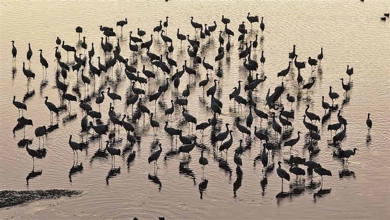 黑頸鶴是全球15種鶴類中唯一在高原地區(qū)生活、繁殖的鶴類,屬國家一級保護動物。每年10月中下旬,大批黑頸鶴從藏北高原飛到拉薩河谷,它們在農田、沼澤地里覓食嬉戲,享受冬日暖陽。