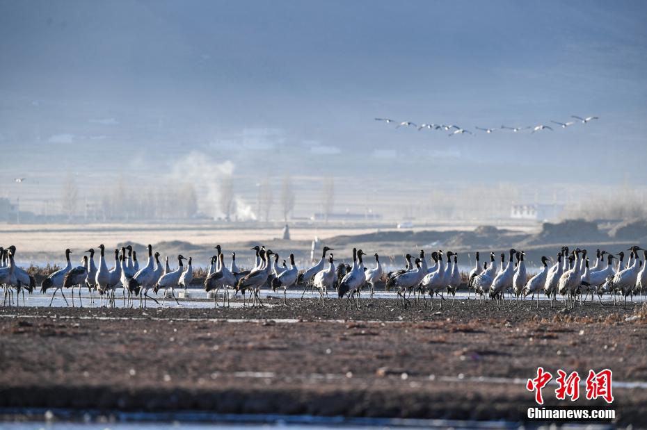 11月27日晨,西藏自治區(qū)拉薩市林周縣黑頸鶴保護區(qū)內,大量越冬的黑頸鶴在虎頭山水庫覓食、嬉戲。林周縣位于拉薩河上游及澎波河流域,平均海拔約4200米,是黑頸鶴的主要越冬地之一。