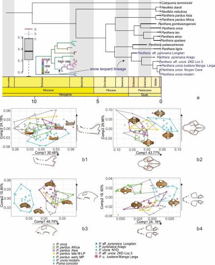 由于青藏高原地區(qū)化石相對稀疏,第四紀(jì)(約260萬前至今)以來的記錄尤為稀少,雪豹是如何逐步演化出如今特化適應(yīng)青藏高原的模樣仍然不明。分子生物學(xué)的研究支持雪豹現(xiàn)生親緣關(guān)系最近的物種是虎,但雪豹和虎的形態(tài)及生態(tài)適應(yīng)都截然不同,僅僅依靠分子生物學(xué)解決不了雪豹是如何特化的問題。