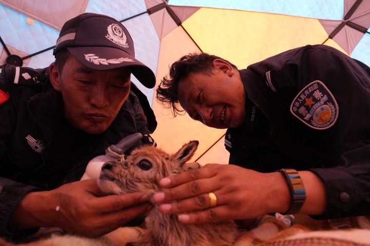 在索南達(dá)杰保護(hù)站駐站的巡山隊員江措告訴記者,在保護(hù)站后面的網(wǎng)圍欄內(nèi),有隊員們從卓乃湖救助回來的小藏羚羊。