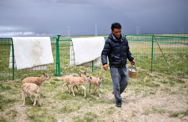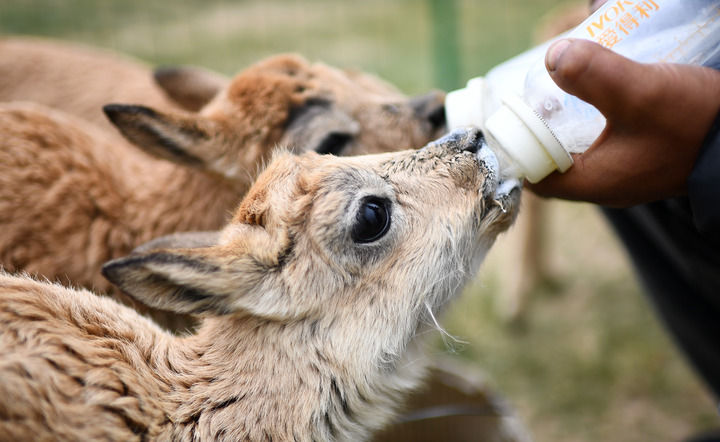 在索南達(dá)杰保護(hù)站,可可西里巡山隊隊員在給被救助的藏羚羊幼仔喂奶(2023年7月28日攝)。新華社記者 張宏祥 攝
