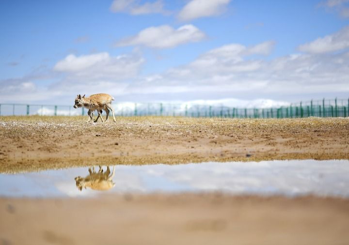 藏羚羊在可可西里國家級自然保護(hù)區(qū)索南達(dá)杰保護(hù)站野生動物救助中心活動(2023年5月30日攝)。新華社記者 薛玉斌 攝