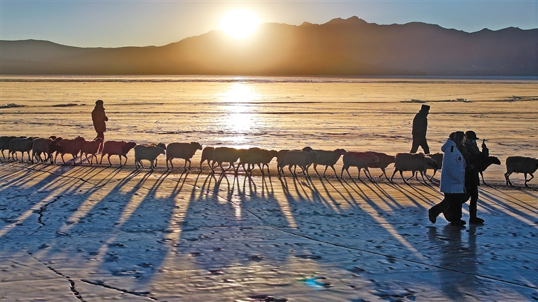 當(dāng)?shù)夭刈迥撩裼惺来鄠鞯内s羊傳統(tǒng),這是為了讓羊群在冬季也能吃到新鮮的牧草。他們將羊群從岸邊趕向湖心島,那里有未被冰雪覆蓋的草地,既保障了羊群的飼料需求,又避免了過(guò)度放牧對(duì)草場(chǎng)的破壞。