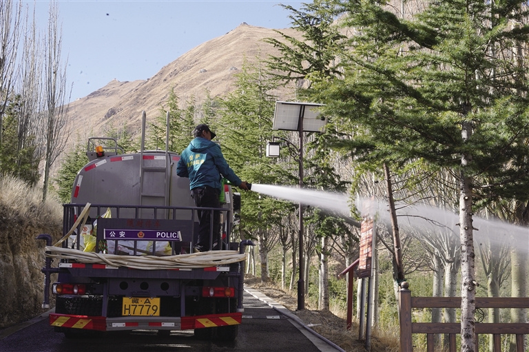 在南山公園,記者看到工人們正忙著給樹(shù)澆水。南山公園安保人員扎西次旺告訴記者:“雖然我是負(fù)責(zé)安保工作的,但是我不忙的時(shí)候也會(huì)去給樹(shù)澆水,因?yàn)檫@里的每一棵樹(shù)、每一株草對(duì)于我們而言都有非常大的意義。通過(guò)大家的努力,我相信我的家鄉(xiāng)會(huì)變得越來(lái)越綠,生態(tài)環(huán)境也會(huì)越來(lái)越好?!?/p>
