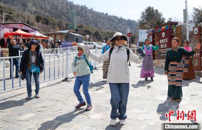 3月28日,西藏自治區(qū)林芝市,游客在雅魯藏布大峽谷旅游景區(qū)學跳藏族舞蹈。雅魯藏布大峽谷全長504.6公里,最深處6009米,被認為是世界上長度最長、深度最深的大峽谷。中新社記者 馬銘言 攝