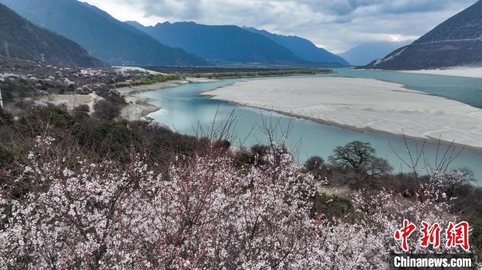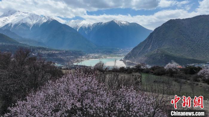 3月28日,西藏自治區(qū)林芝市,雅魯藏布江碧綠的江水與岸畔的桃花、遠處的雪山相映成趣,春意盎然。中新社記者 馬銘言 攝