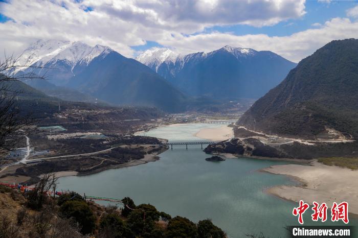 3月28日,西藏自治區(qū)林芝市,雅魯藏布江碧綠的江水與遠處的雪山相映成趣,景色如畫。中新社記者 馬銘言 攝