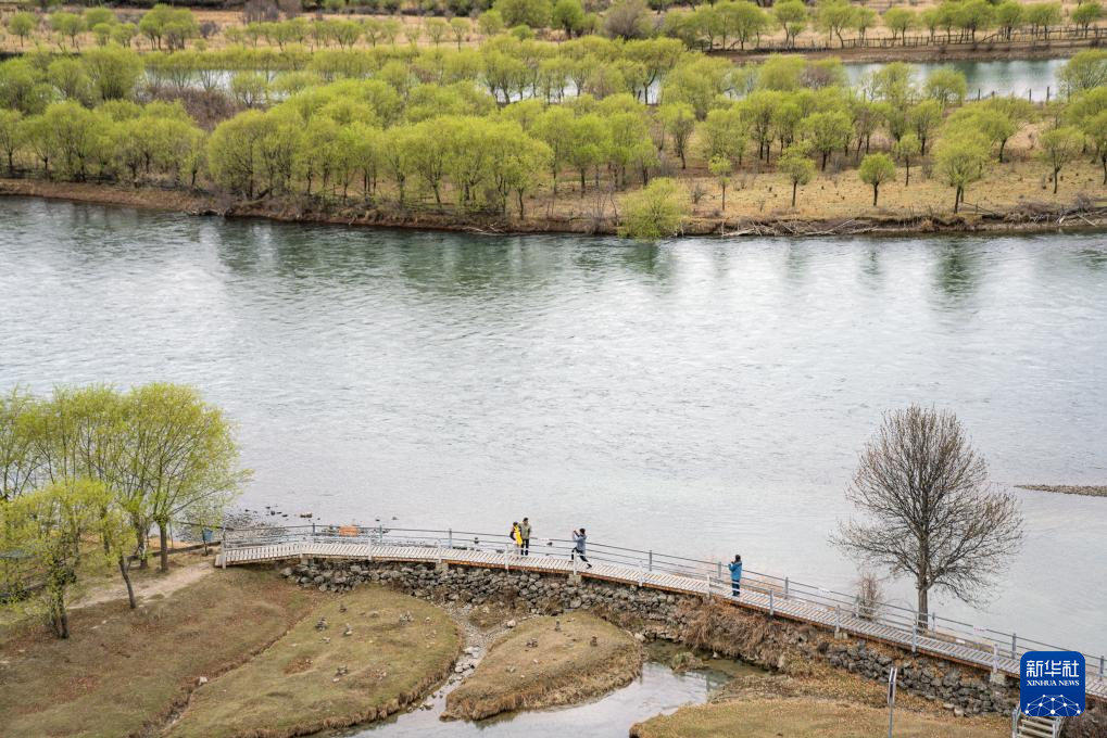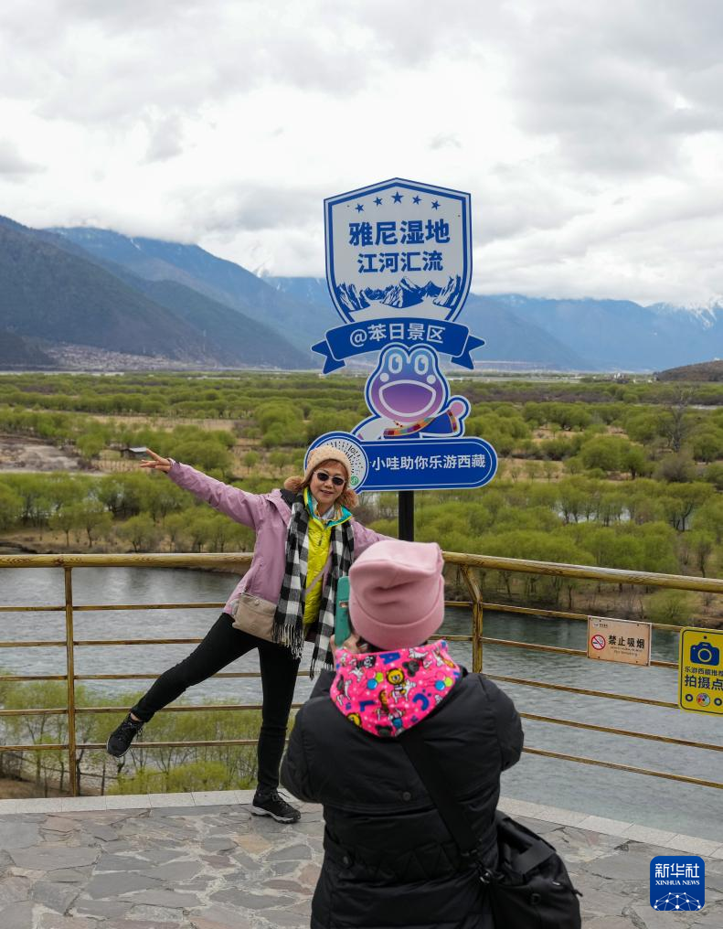 4月4日,游客在雅尼國家濕地公園觀景臺拍照打卡。新華社記者 晉美多吉 攝