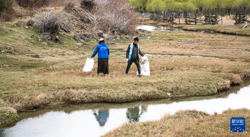 4月4日,雅尼國家濕地公園管護(hù)員在巡護(hù)途中清理垃圾。新華社記者 丁增尼達(dá) 攝