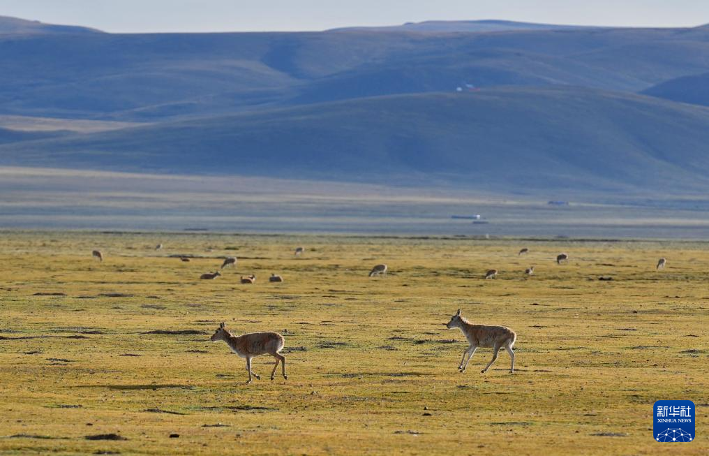 色林錯國家級自然保護(hù)區(qū)那曲市申扎縣片區(qū)里的藏羚羊(2024年8月26日攝)。新華社記者 張汝鋒 攝