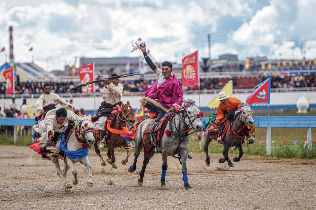 2023年8月10日,騎手在那曲市恰青賽馬節(jié)開幕式上進行馬術(shù)表演。新華社記者邵澤東攝