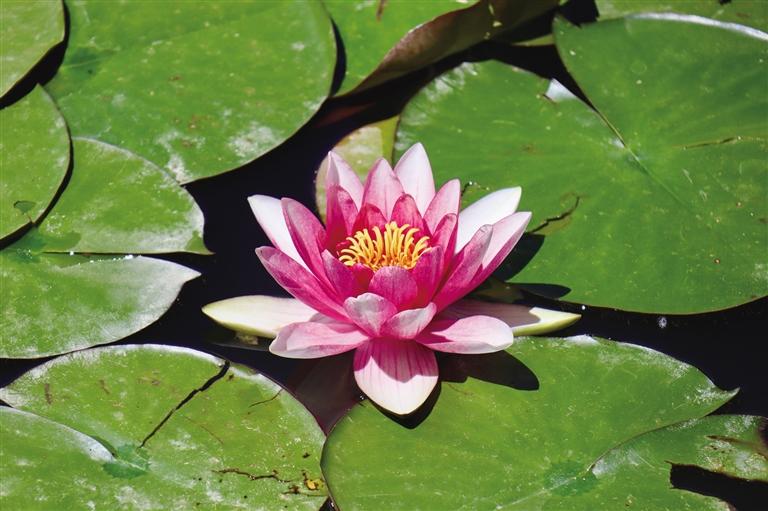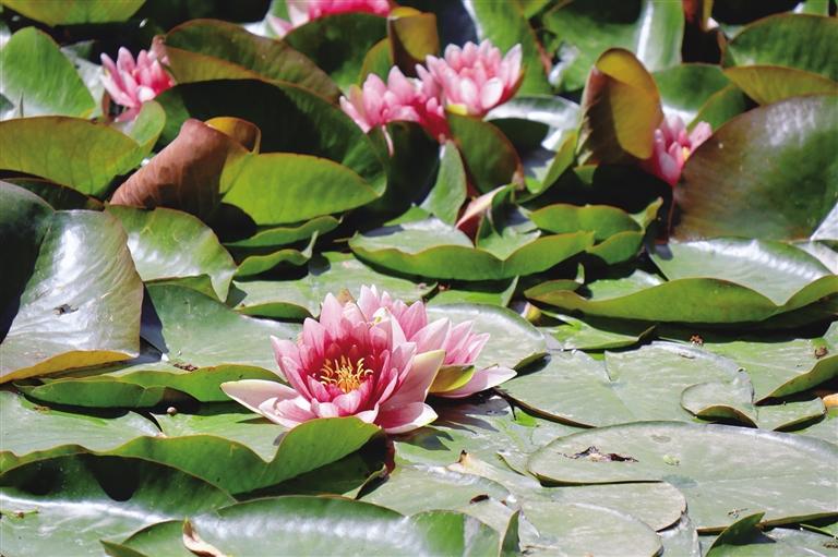 “移舟水濺差差綠,倚欄風(fēng)搖柄柄香?!弊哌M(jìn)柳梧國(guó)際總部城院內(nèi),在停車場(chǎng)的東側(cè),一池蓮花在層層蓮葉的襯托下開得正盛。走近池邊,蓮葉特殊的淡淡香味夾雜著潮濕的水汽撲面而來。粉、白的蓮花在幾場(chǎng)雨過后,迎著陽光依次綻放。幾個(gè)孩子在池邊嬉戲追逐,時(shí)不時(shí)用手挑起水花四濺,遠(yuǎn)遠(yuǎn)看去,頗有“小姑貪戲采蓮遲”的意味。
