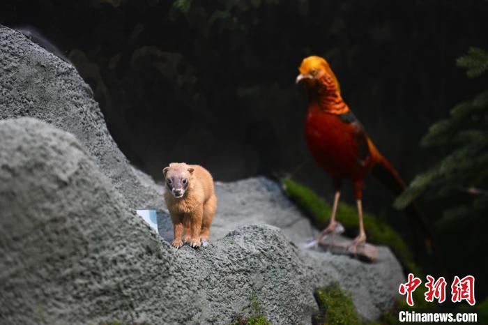 6月16日,在位于甘肅省張掖市肅南裕固族自治縣的祁連山國家公園自然博物館展陳的黃鼬標本(左)。中新社記者 李亞龍 攝