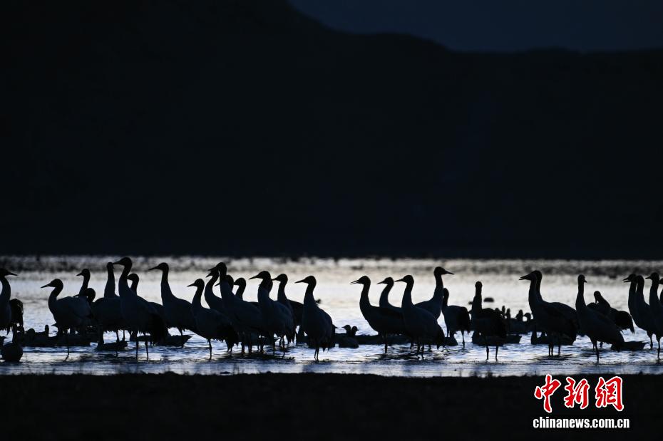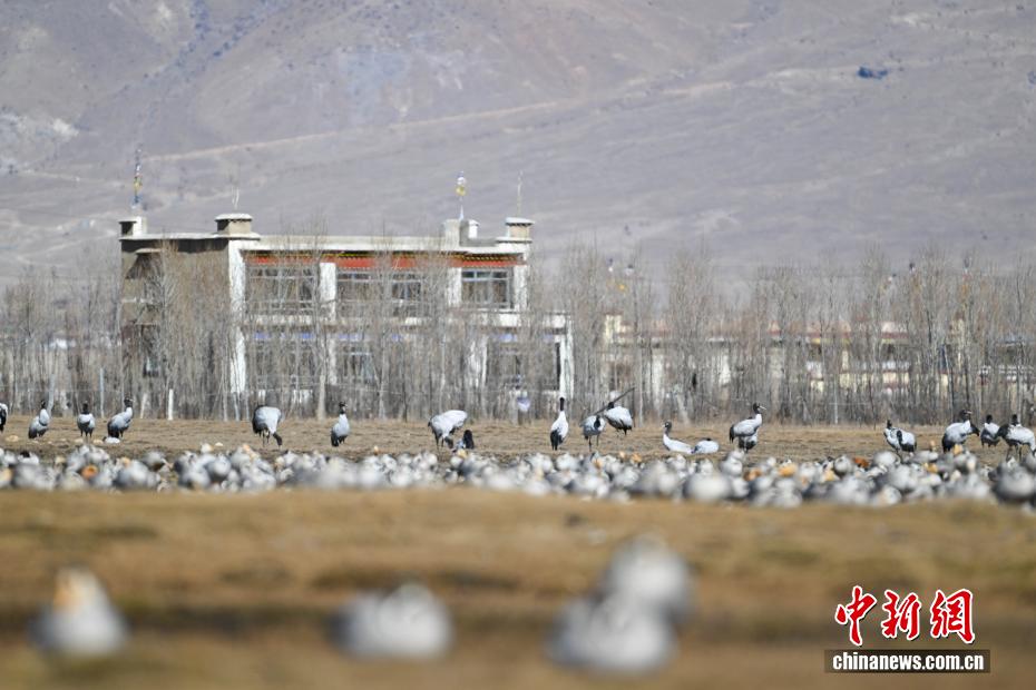 11月26日,位于西藏自治區(qū)拉薩市林周縣的黑頸鶴自然保護(hù)區(qū)內(nèi),大量越冬的黑頸鶴在卡孜水庫(kù)、農(nóng)田、濕地里覓食、嬉戲。林周縣位于拉薩河上游及澎波河流域,是黑頸鶴的主要越冬地之一。中新社記者 貢嘎來(lái)松 攝