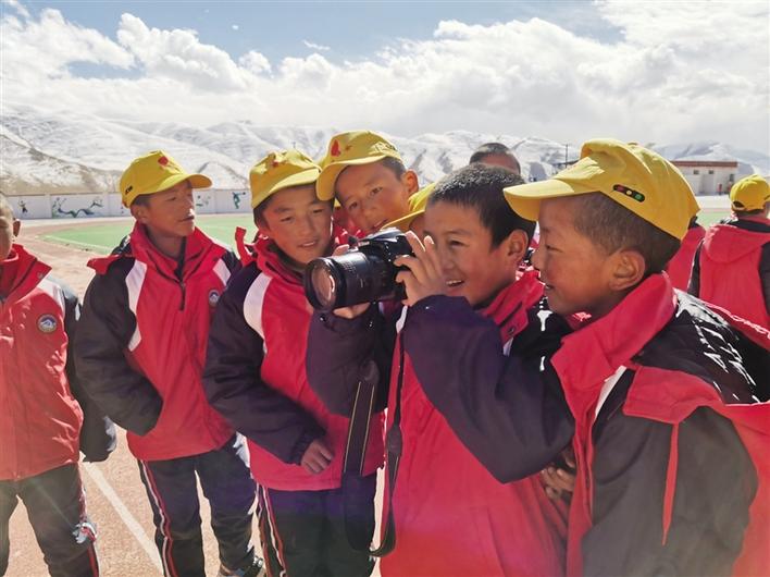 美術教室布置之初,從一年級到六年級,二三十名學生追到新教室,拿著彩筆在墻上畫出一幅幅稚嫩卻充滿童趣的圖畫?!拔蚁氘嬕粋€城堡,給它圖上美麗的顏色!”“我要把牦牛畫在墻上?!薄拔乙媯€飛行員”……