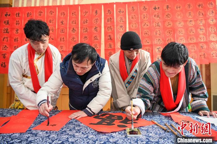 寫春聯(lián)、掛燈籠、做湯圓……在綿綿的藏歌聲中,留校西藏學(xué)生向陪伴他們連續(xù)度過了兩年春節(jié)的“代表媽媽”們敬獻了潔白哈達,而“代表媽媽”則為她們的“西藏孩子”們圍上了紅色圍巾,互相傳遞著美好祝愿。