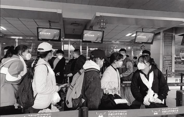 返程學(xué)生在貢嘎機(jī)場(chǎng)辦理登機(jī)手續(xù)。圖由民航西藏區(qū)局提供