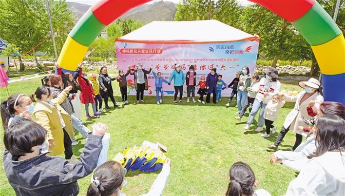 圖為柳梧新區(qū)管委會(huì)的干部和孩子們做游戲。 記者 潘多 次旺 攝