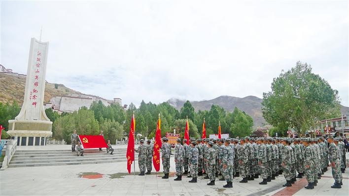 圖為駐藏某汽車團(tuán)野外駐訓(xùn)分隊(duì)在江孜宗山英雄紀(jì)念碑前開展主題黨課活動。加央群決 李豪 攝