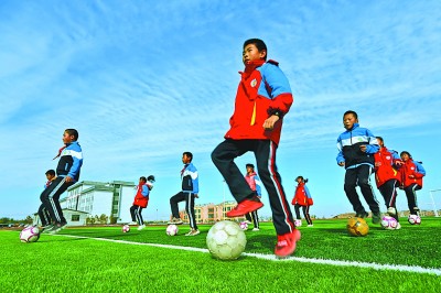 甘肅省民樂生態(tài)工業(yè)園區(qū)學校足球場上,學校足球隊的孩子們進行傳球、帶球訓練。王將攝/光明圖片