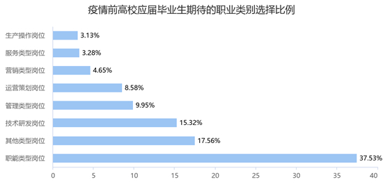 疫情前應屆畢業(yè)生期待的職業(yè)類別選擇比例由高到低依次為職能類型崗位(如行政、人事、財務等,37.53%)、其他類型崗位(17.56%)、技術研發(fā)崗位(如研發(fā)工程師、測試等,15.32%)、管理類型崗位(9.95%)、運營策劃崗位(如運營、產(chǎn)品、設計等,8.58%)、服務類型崗位(如客服、服務員、店員等,3.28%)、生產(chǎn)操作崗位(如職業(yè)業(yè)生產(chǎn)崗位等,3.13%)。疫情后和疫情前完全一致,選擇比例由高到低依次為職能類型崗位(37.65%)、其他類型崗位(18.08%)、技術研發(fā)崗位(14.67%)、管理類型崗位(9.79%)、運營策劃崗位(8.40%)、服務類型崗位(3.53%)、生產(chǎn)操作崗位(3.18%)。