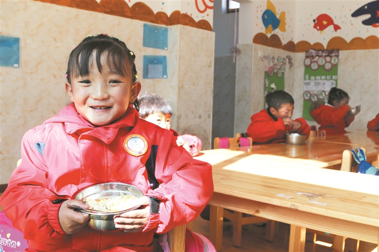 圖為白朗村幼兒園的學(xué)生在吃午餐。 龍俊霖?cái)z