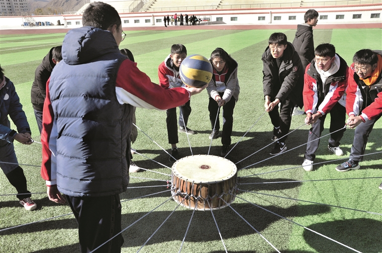 上午10時,課間操時間,拉薩北京中學全體學生集中在學校操場,在西藏塔嘎布體育發(fā)展公司教練的帶領下,該校兩個班級50多名學生興高采烈地參與到拓展運動中,一起進行“花開花落”“擊鼓顛球”“動力繩”等7個項目的拓展運動訓練。同學們通過共同合作完成指定運動,在歡笑聲中一起進行趣味運動。拉薩北京中學相關負責人表示,此次趣味體育拓展活動不僅有利于促進學生的心理素質,還能增強學生之間的團隊意識,希望同學們積極參與、發(fā)揚體育精神。