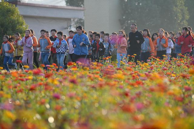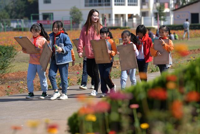 寨下鎮(zhèn)中心小學(xué)的學(xué)生們前往花田上美術(shù)課(11月9日攝)。