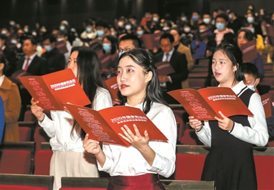 活動(dòng)現(xiàn)場(chǎng),北京主會(huì)場(chǎng)學(xué)生領(lǐng)唱《憲法伴我們成長(zhǎng)》,從優(yōu)美的歌聲中體會(huì)憲法力量。北京外國(guó)語大學(xué)黨委書記王定華宣讀了第五屆全國(guó)學(xué)生“學(xué)憲法 講憲法”全國(guó)總決賽獲獎(jiǎng)名單。
