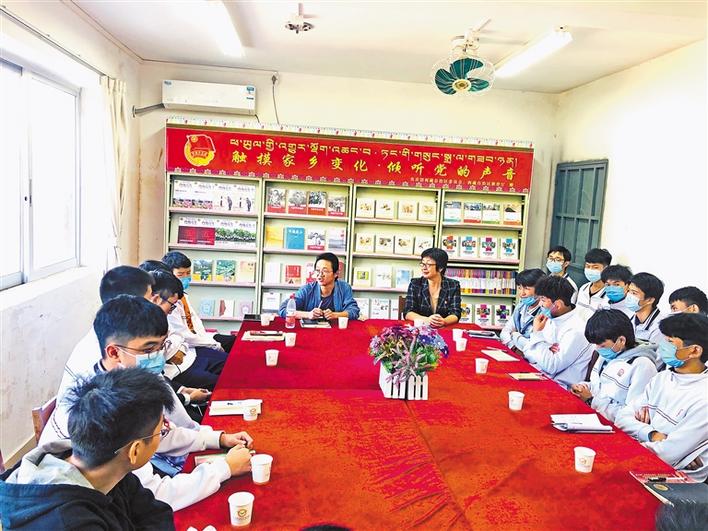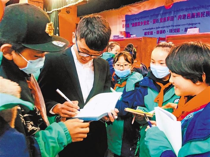 宣講活動(dòng)過(guò)程中,共青團(tuán)西藏自治區(qū)委員會(huì)副書(shū)記格桑卓瑪、西藏青年報(bào)社副社長(zhǎng)洛桑頓珠給6所學(xué)校內(nèi)地西藏班的學(xué)生們贈(zèng)送了《西藏青年報(bào)》《西藏青年》等刊物和書(shū)籍。格桑卓瑪語(yǔ)重心長(zhǎng)地囑咐孩子們:“作為新時(shí)代的新青年,要時(shí)刻牢記時(shí)代賦予的新使命,要用新時(shí)代的標(biāo)尺審視自己,用科學(xué)文化武裝自己,淡化宗教消極影響,在新征程的熔爐中鍛造自己,努力使自己成為堪當(dāng)民族復(fù)興大任的新青年,在全面建設(shè)社會(huì)主義現(xiàn)代化國(guó)家新征程中貢獻(xiàn)自己的青春力量,做神圣國(guó)土的守護(hù)者、幸福家園的建設(shè)者,在青春的閃光中踐行‘感黨恩、愛(ài)核心、聽(tīng)黨話、跟黨走’的家國(guó)情懷。”