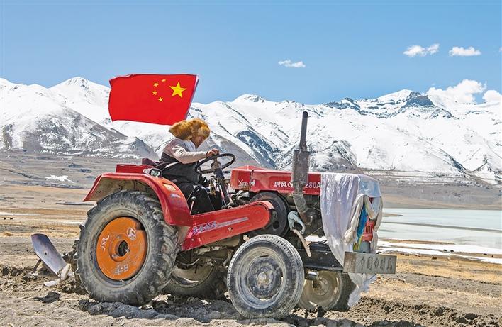 4月30日,拖拉機在西藏那曲市尼瑪縣當穹錯旁舉行的春耕典禮上行進。新華社記者 侯捷 攝