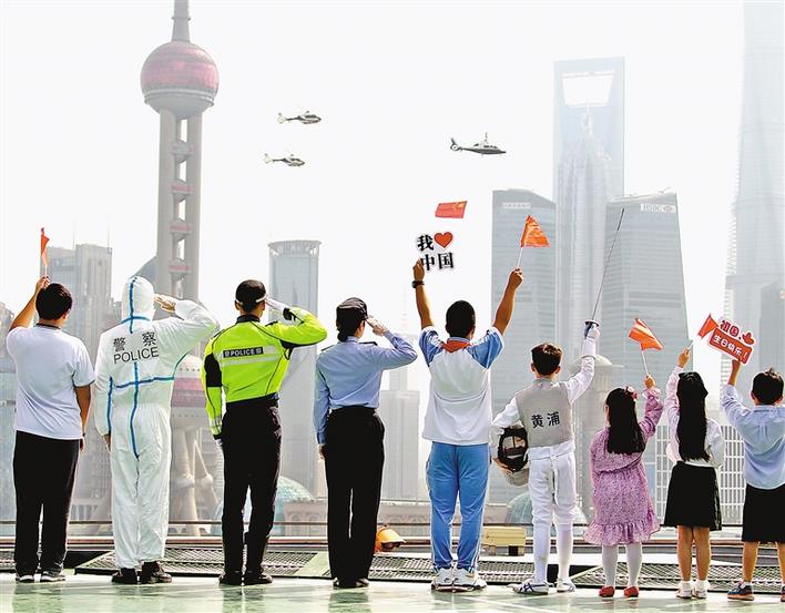 10月1日,警用直升機懸掛著五星紅旗飛過上海黃浦江上空。新華社記者 陳飛 攝