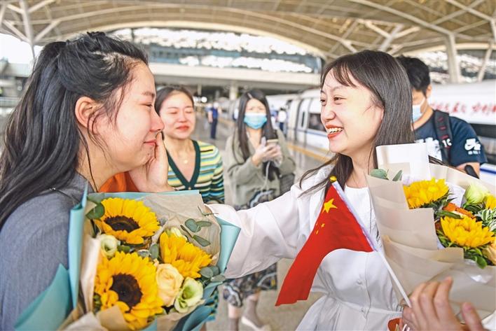 10月1日,一批馳援過武漢抗疫的江蘇醫(yī)療隊隊員重回武漢,曾經(jīng)并肩戰(zhàn)斗的江蘇援鄂醫(yī)療隊員吳衛(wèi)娟(右)和武漢市江夏中醫(yī)院的董璇(左)再度相逢,喜極而泣。新華社記者 程敏 攝