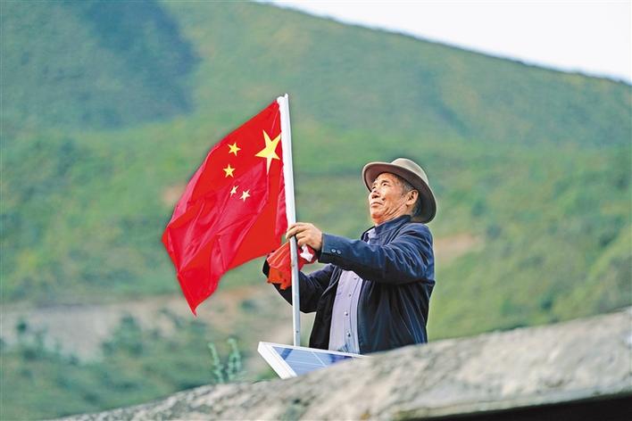 9月25日,在西藏昌都市江達縣崗托村,普巴在屋頂上換上嶄新的國旗,這是他每月進行一次的“儀式”。今年是昌都解放70周年,普巴說,現(xiàn)在我們的美好日子,是解放軍用生命和鮮血換來的,這份恩情,我們不會忘記。新華社記者 詹彥 攝