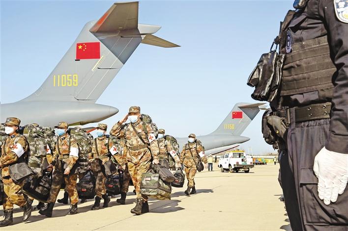 2月17日,軍隊支援湖北醫(yī)療隊員抵達武漢天河機場。新華社記者 黎云 攝