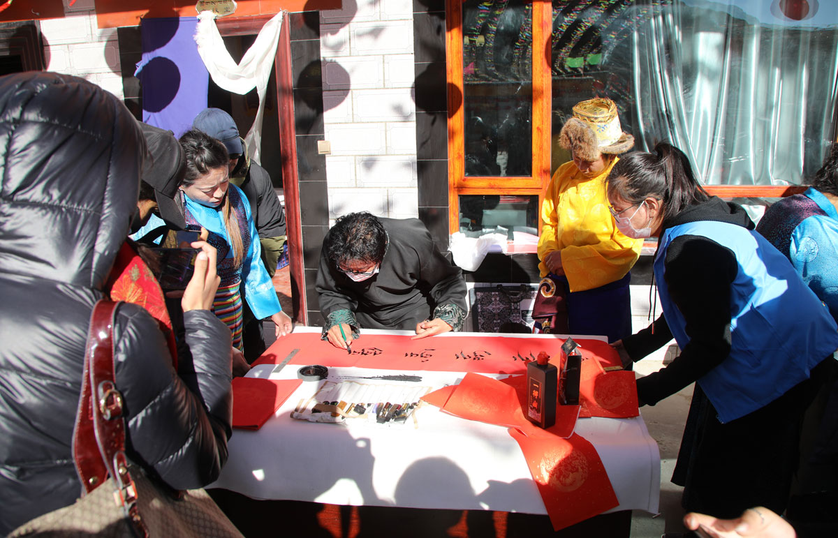 西藏自治區(qū)書協(xié)副主席、拉薩市書協(xié)副主席南杰旺扎說:“值此新春佳節(jié)和藏歷新年來臨之際,拉薩市文聯(lián)書法家協(xié)會組織了三位老師來到吉蘇村開展送書法活動,一是宣傳黨的好政策,二是雙節(jié)臨近給基層干部群眾送上節(jié)日的祝福。”