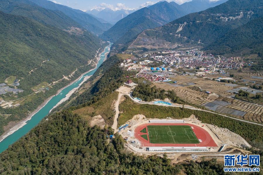 這是墨脫縣新修建的11人制足球場(chǎng)(2月13日攝,無(wú)人機(jī)照片)。新華社記者 羅博 攝