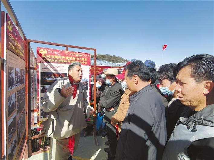 圖為在桑珠孜區(qū)甲措雄鄉(xiāng)文化廣場,宣講員結(jié)合展板圖文內(nèi)容開展黨史學(xué)習(xí)教育宣講。汪純 攝