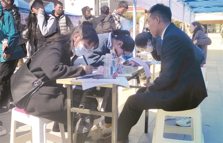 拉巴占堆是西藏大學(xué)藏語(yǔ)言文學(xué)師范專業(yè)的一名大四畢業(yè)生,他曾在拉薩北京實(shí)驗(yàn)中學(xué)實(shí)習(xí)過(guò),對(duì)教育工作充滿熱情。招聘會(huì)現(xiàn)場(chǎng),他向卓夢(mèng)培訓(xùn)等教育相關(guān)企業(yè)都投遞了簡(jiǎn)歷?!拔彝读藥追莺?jiǎn)歷了,希望能夠找到和自己專業(yè)相關(guān)的工作,實(shí)現(xiàn)自己的價(jià)值。”拉巴占堆說(shuō)。