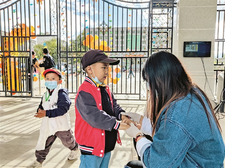 圖為在拉薩江蘇實驗幼兒園門口,老師對入園幼兒進(jìn)行手部檢查。拉薩融媒記者 余洋洋攝